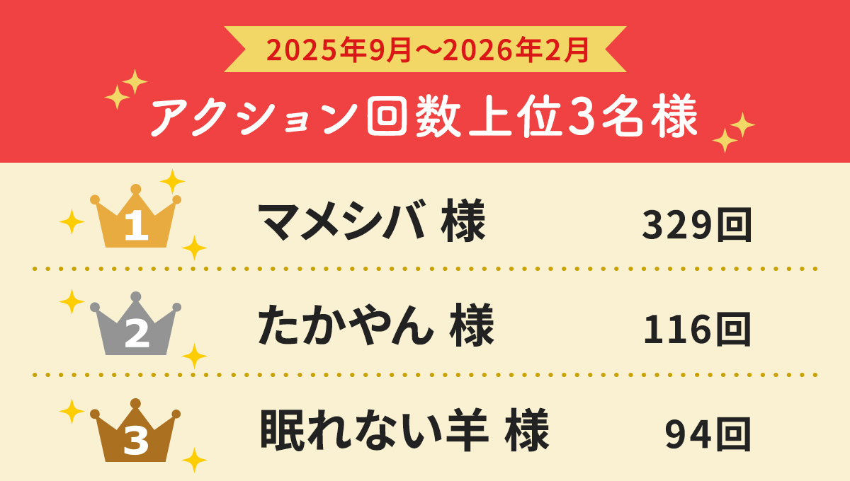 引き続きアクション回数特典を実施してまいりますので皆さま奮ってご参加くださいませ!
